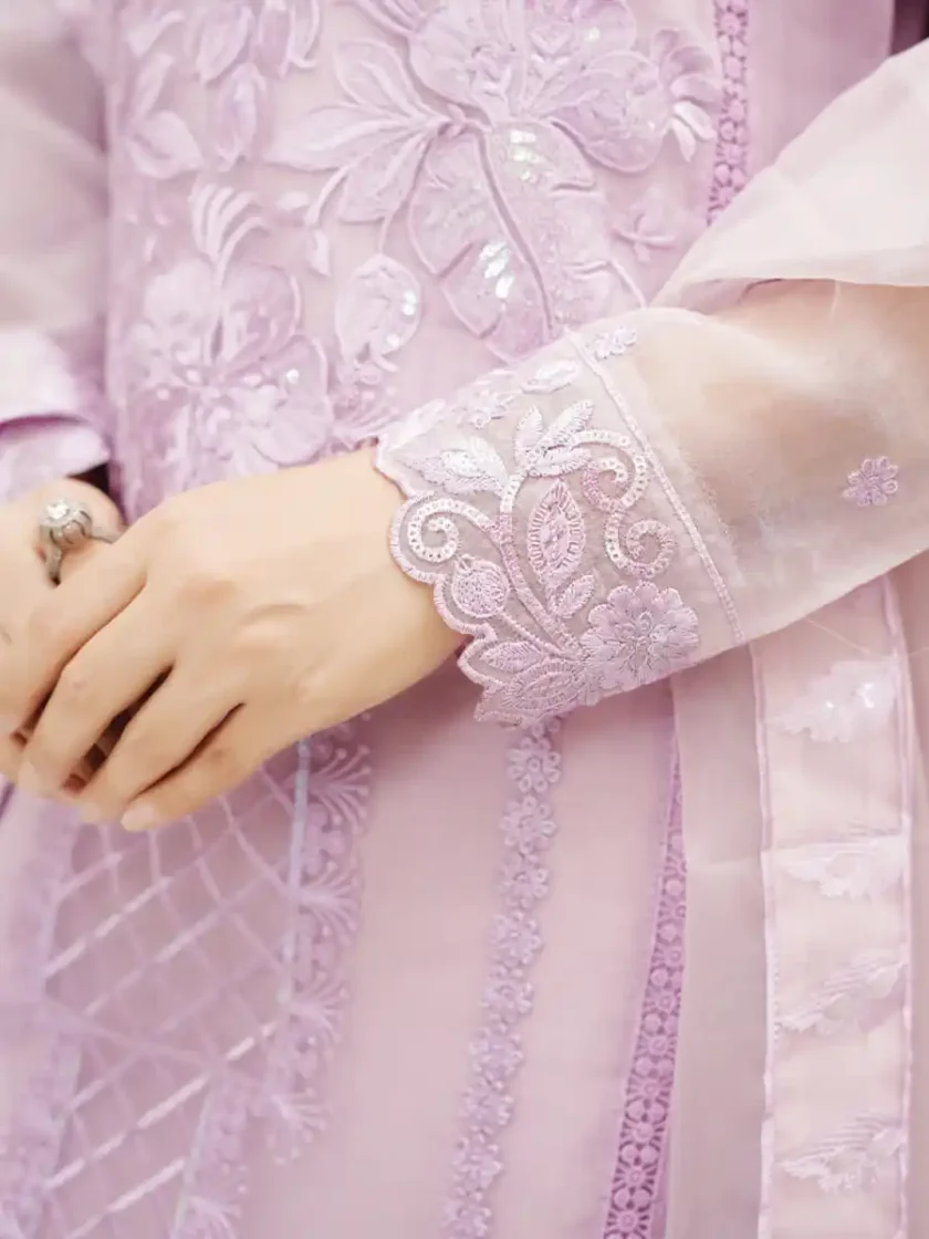 1. Elevate your style with this elegant stitched embroidered purple organza dress, designed to make a refined fashion statement.