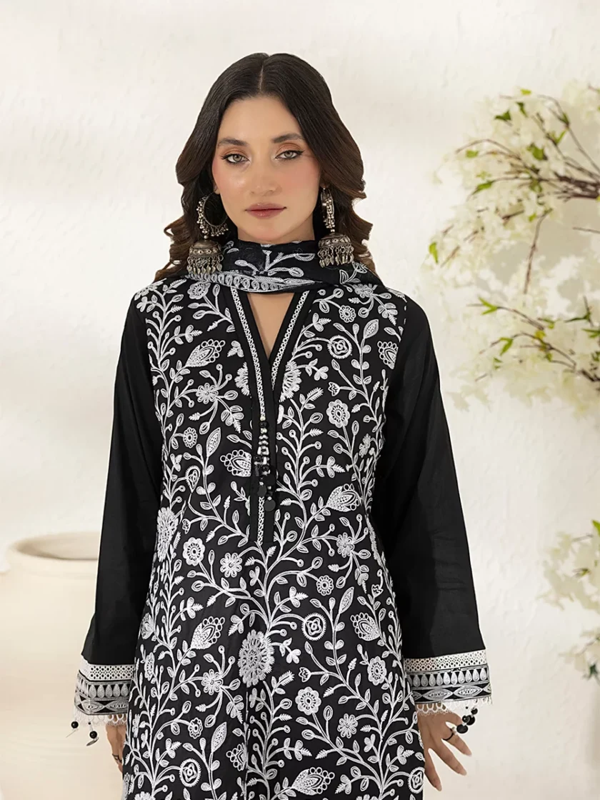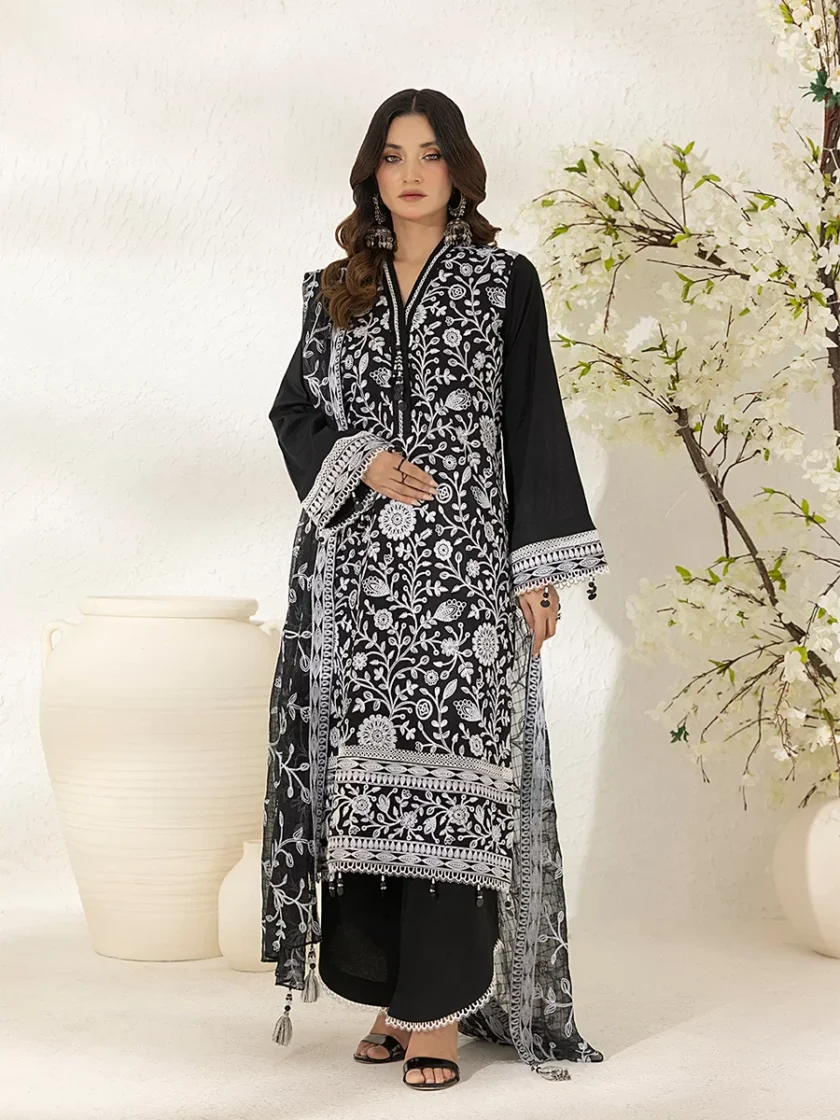 Unstitched 3 Piece Embroidered Cambric Dress With Chiffon Check Embroidered Dupatta-Salitex Monochrome